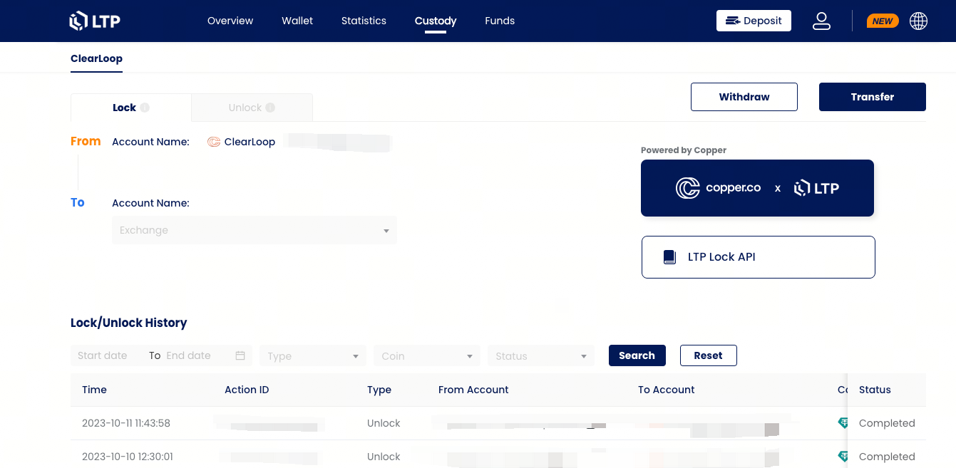 "Lock" refers to allocate assets from CL Trading Account to targeted exchange. To utilise the Copper Clearloop service, you need to initiate a transfer of your assets from your funding account or exchange sub-accounts to your CL trading account. Once is done, you can proceed to "lock" your assets from your CL trading account onto your desired exchange. Kindly follow the instructions provided on the dashboard to lock your assets. Once the status changes to "completed," you will be able to verify your assets on the targeted exchange sub account.
