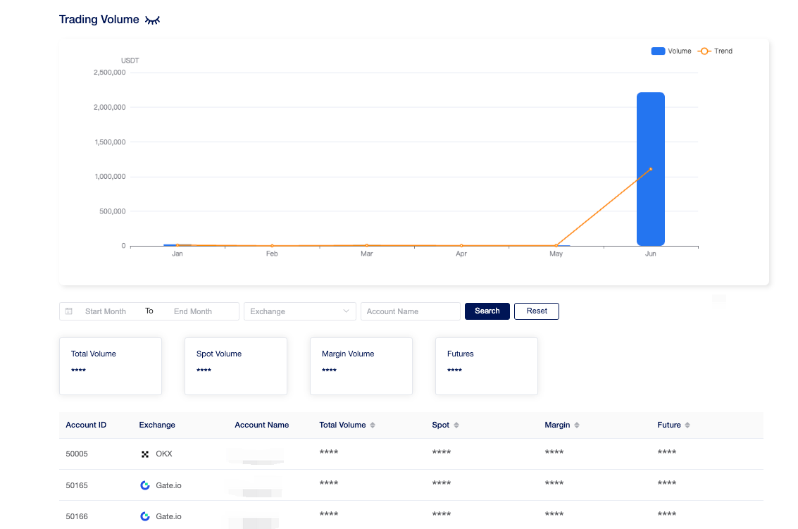 Under the "Statistics" tab users can view transaction volumes for the past six months, as well as a list of accounts and account balances.